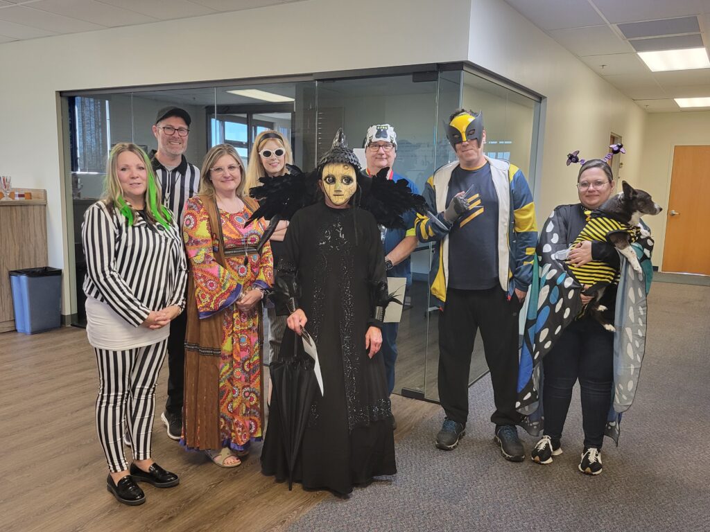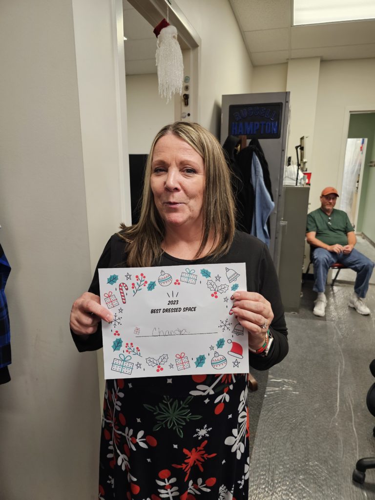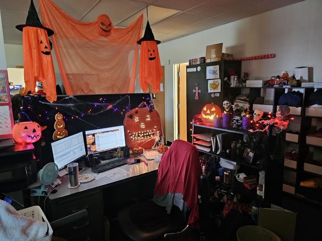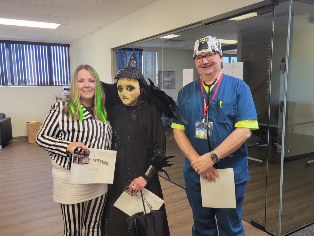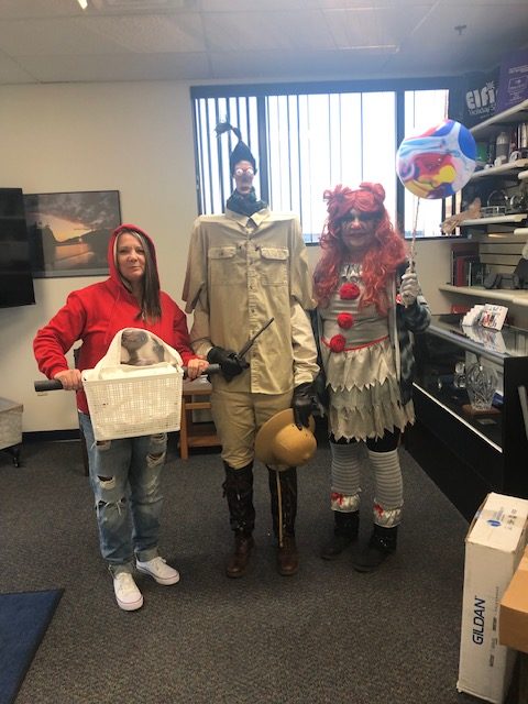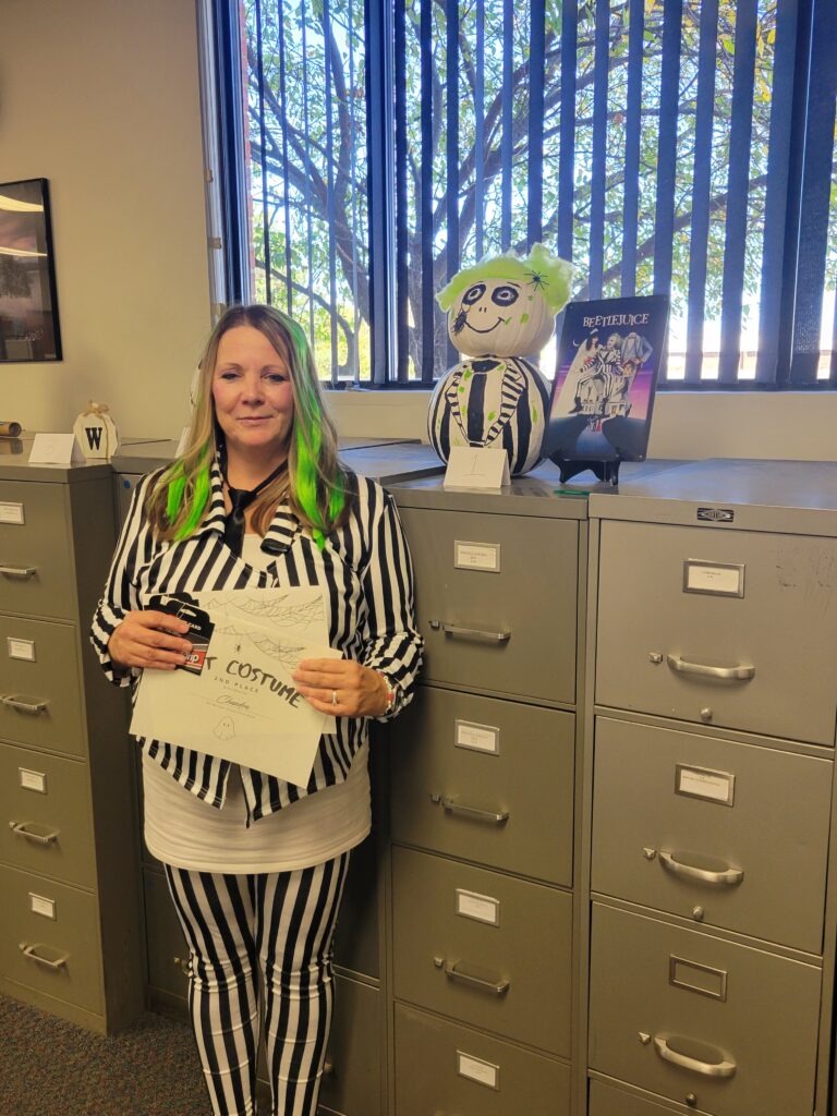 Once again Patty dominated the competition and won 1st place for her costume. Chandra received 2nd place for her costume. It was suggested we do best pumpkin instead of decorated space. Chandra also won this category with her Beetlejuice pumpkin. Lots of wonderful treats were enjoyed as well. We also gave James a “Best New Employee” certificate for providing treats two days this week. Time to start thinking about Christmas Spirit